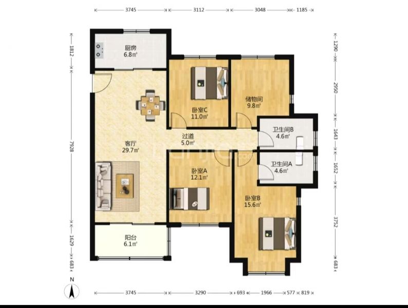 131m²/3室1厅